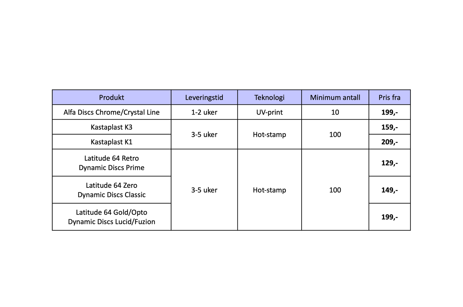 Vi tilbyder print på alle diske fra Latitude 64, Dynamic Discs, Westside Discs, Alfa Discs og Kastaplast. Vi leverer Alfa Discs med UV-tryk, og de øvrige mærker med varmstempling. Læs mere og se eksempler længere nede på siden eller download vores brugerdefinerede printguide.